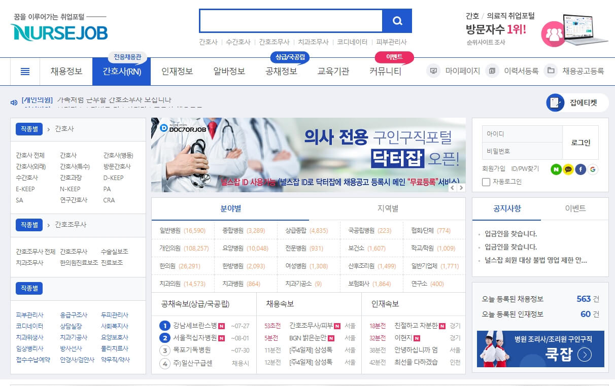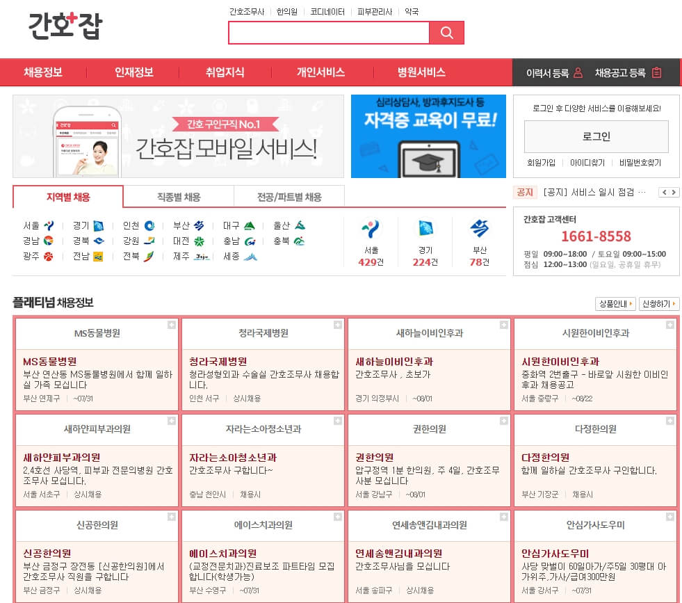 아마 가장 큰 규모에 간호사 또는 간호조무사 구인구직 홈페이지가 아닐까 생각됩니다. 그래서 그런지 역시 방문자 수 1위라는 타이틀을 메인에서 안내하고 있습니다.