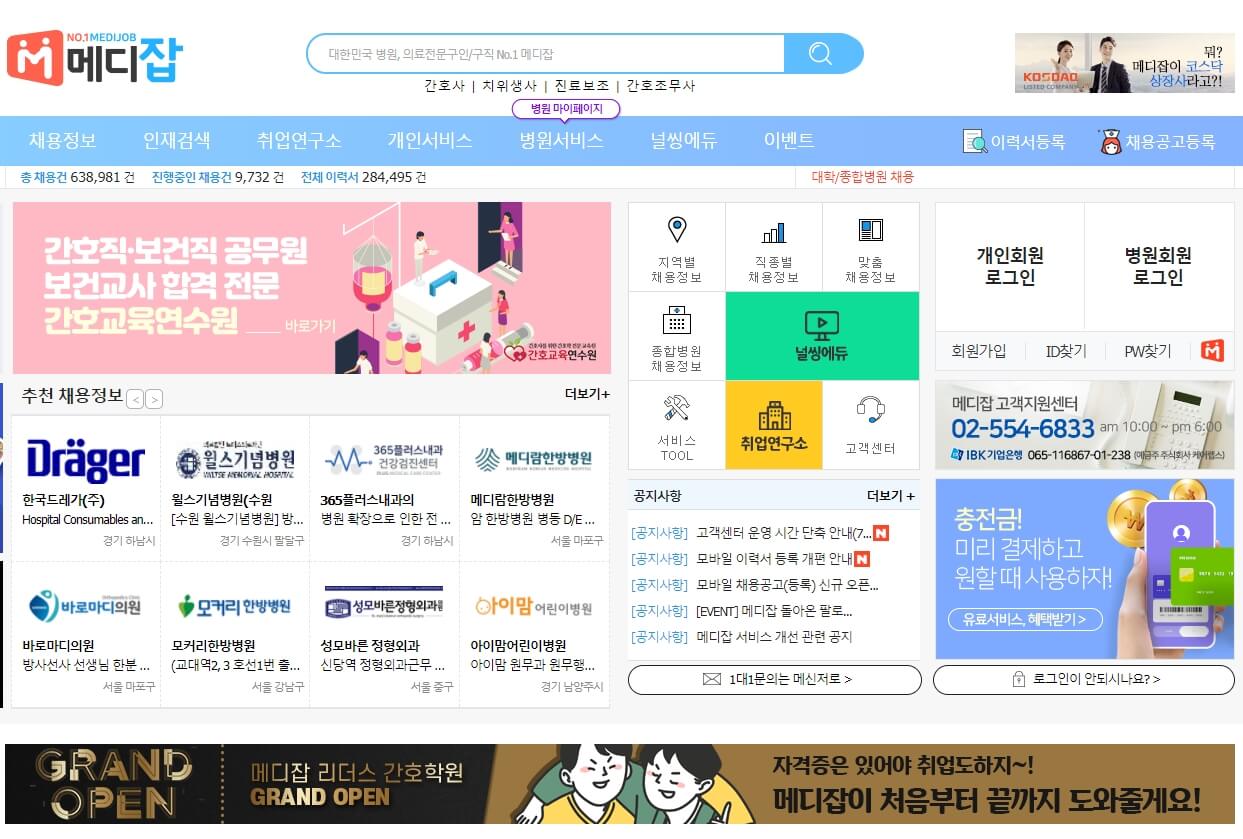 해당 사이트에 경우는 단순히 간호 계열에 구인구직 뿐만 아니라 의사 직종까지 채용 정보를 등록 및 검색할 수 있는 홈페이지입니다.