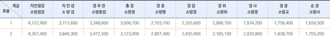 위와 같은 방법을 통해서 2021년도 소방공무원 연봉 실수령액을 확인 할 수 있는 테이블은 다음과 같습니다. 해당 테이블을 확인하는 방법은 호봉과 계급으로 구분됩니다. 아마 제일 초기에 공무원에 합격하는 경우에는 순경 소방사로 1호봉에 해당하는 1,659,500원 월급을 받는 것으로 확인됩니다.