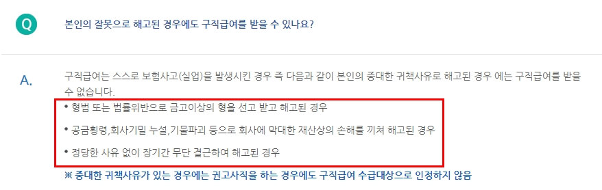 ※ 구직급여는 실업의 의미를 충족하는 비자발적 이직자에게 수급자격을 인정하는 것이지만, 자발적 이직자의 경우에도 이직하기 전에 이직회피노력을 다하였으나 사업주측의 사정으로 더 이상 근로하는 것이 곤란하여 이직한 경우 이직의 불가피성을 인정하여 수급자격을 부여함