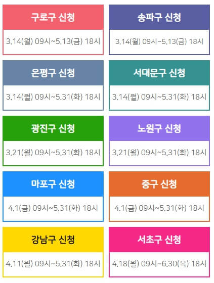 중요사항! 자치구별로 접수 일정과 절차가 다소 차이가 있다. 본인이 거주하고 있는 주소지에 지자체에 신청하고 문의하셔야 합니다.