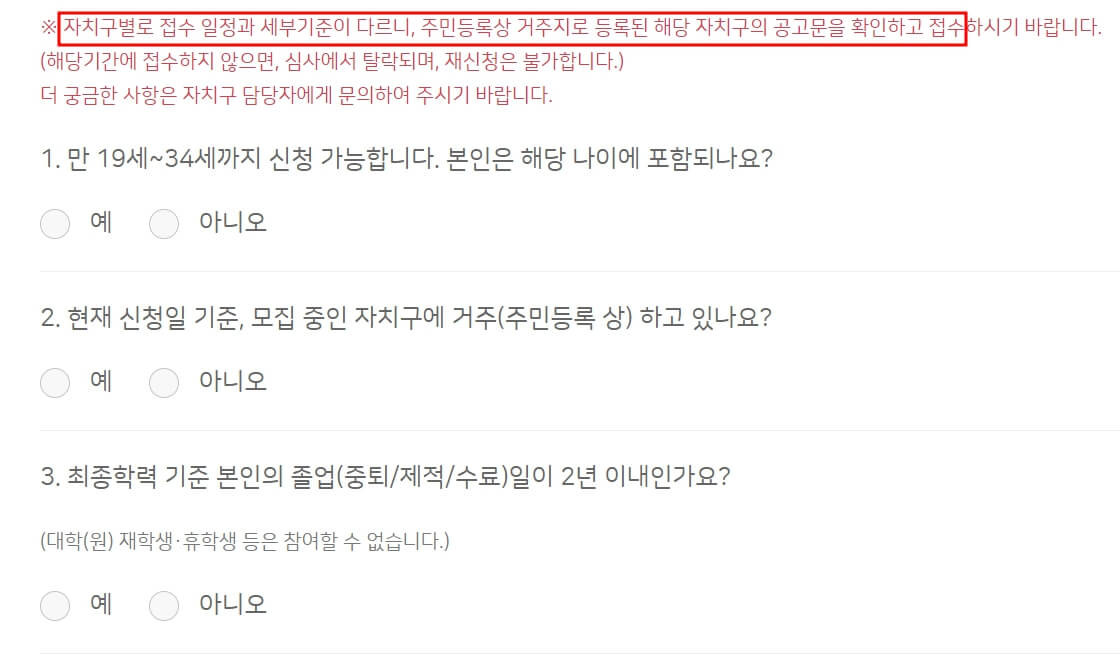 ▷ 본인 거주(주민등록 상)하는 자치구 모집일정 및 지원대상 요건 확인 필수입니다.