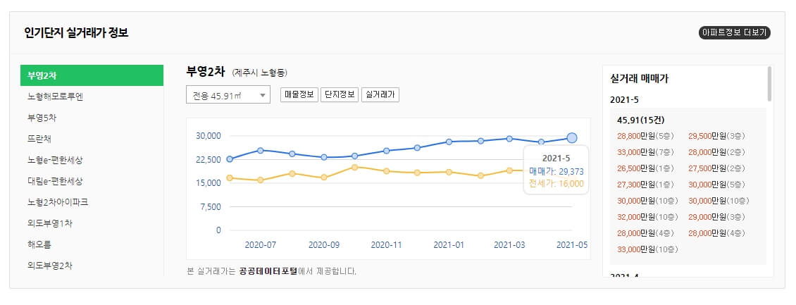 부동산에 경우 중요한 정보는 최근 거래 시세에 변화라고 할 수 있습니다. 매물을 선택하여 제주 교차로에서 다음과 같이 시세 변화를 확인 할 수 있는 서비스도 제공하고 있습니다.