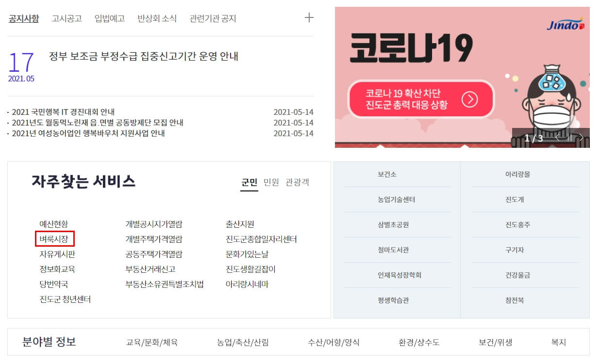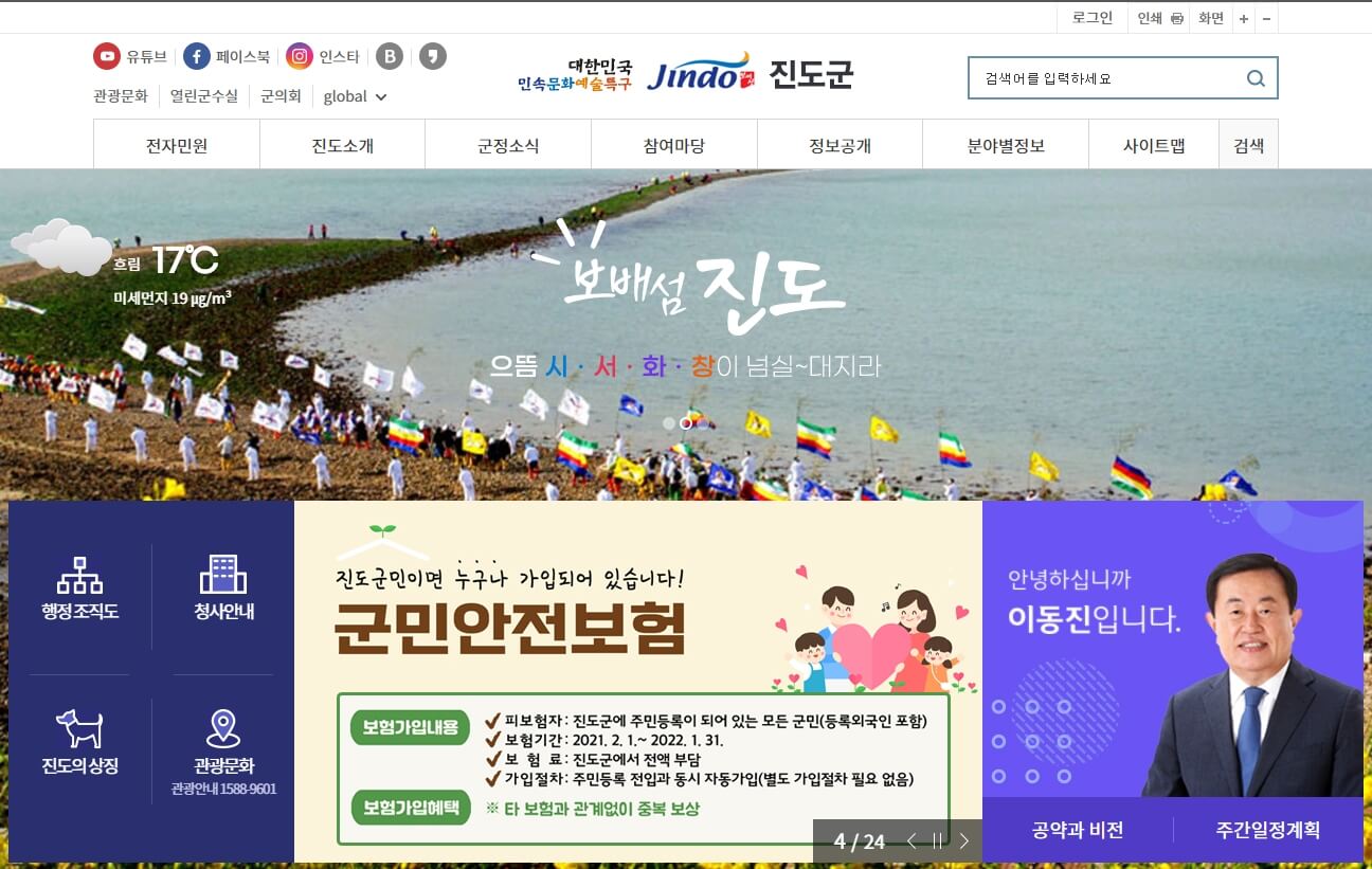 그리고 해당 진도군청 홈페이지를 통해서 진도 소개, 특산품, 벼룩시장, 구인구직, 부동산까지 진도군에서 나오는 모든 정보를 공고하는 군청에 홈페이지라고 생각하시면됩니다. 해당 홈페이지에 메인 화면은 다음과 같이 구성 되어 있습니다.