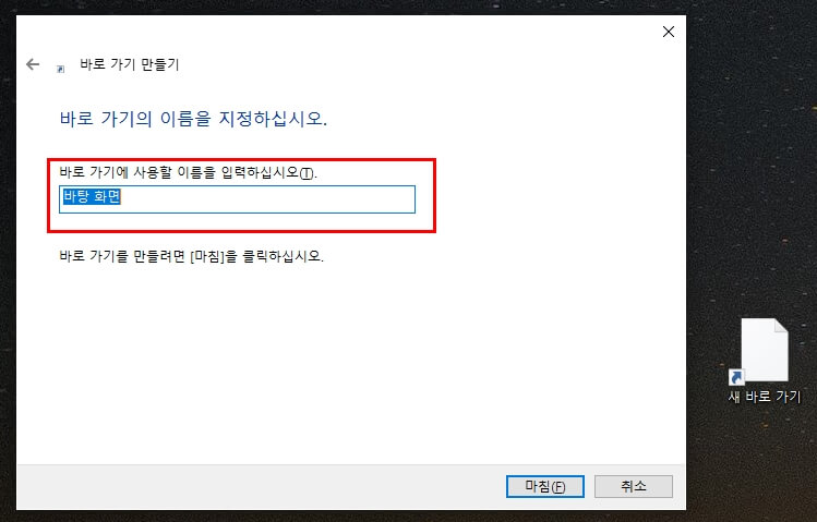 다음 버튼을 클릭하시면 바로가기 아이콘에 이름을 설정할 수 있는 화면이 노출 됩니다. 여기서 희망하는 이름을 입력하세요. 예를 들어서 진도군청 벼룩시장 바로가기와 같은 이름을 입력하고 마침 버튼을 클릭하시면 가볍하게 해당 아이콘을 만들 수 있습니다.