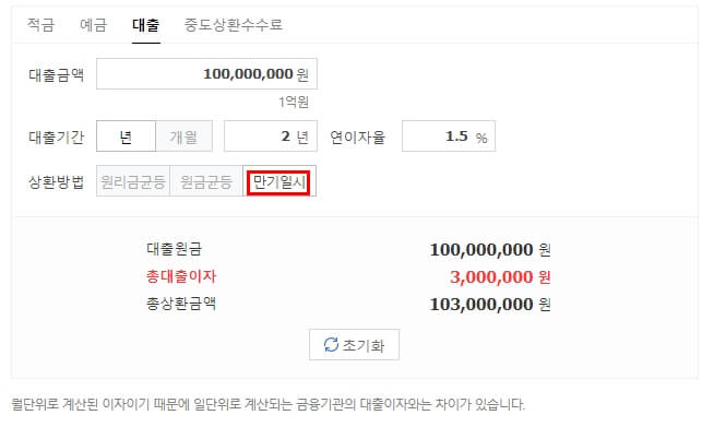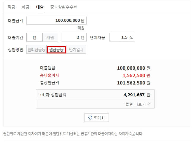 해당 부분은 대출 이자 계산기를 통해서 확인할 수 있습니다. 상환방법에 따라서 월 납입해야 하는 이자가 상이하기 때문에 해당 부분을 확인해야 합니다.