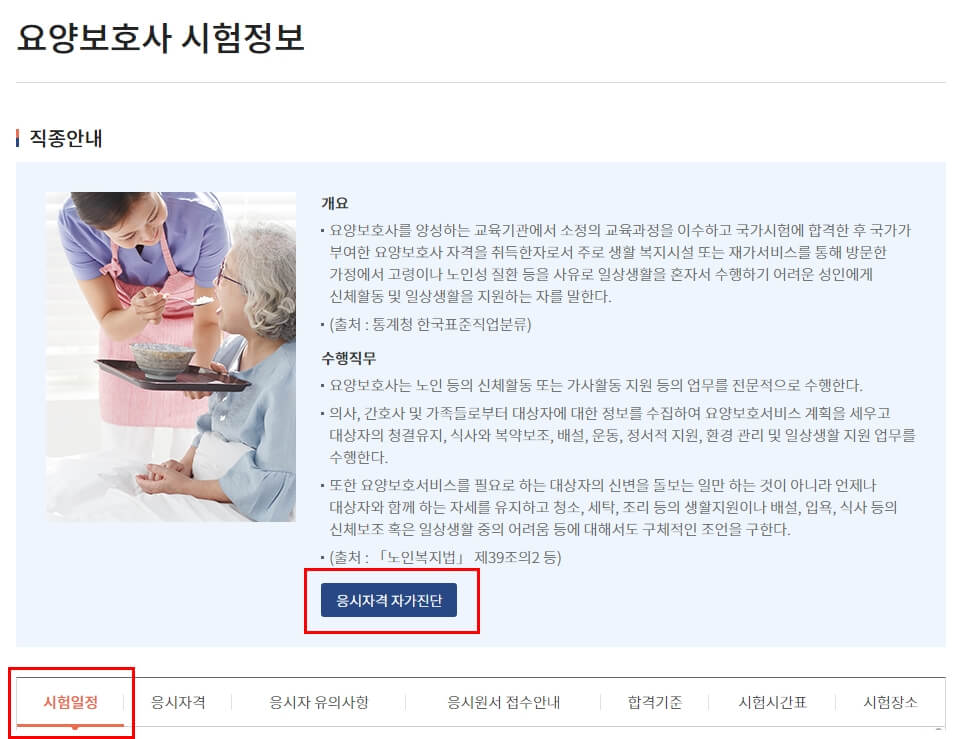 해당 요양보호사와 같은 보건 계열에 자격증에 경우 응시를 할 수 있는 자격이 존재합니다. 그렇기 때문에 해당 사이트를 통해서 자가 진단하여 내가 응시 가능한 해당자인지 확인하고 시험을 준비하는 것을 추천드립니다.