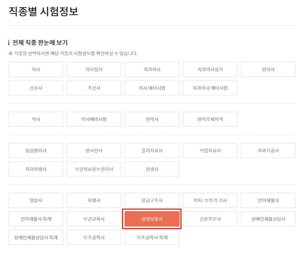 이와 같이 요양보호사를 비롯하여 보건 분야에 전문 직종에 대한 다양한 정보를 항목별로 확인 할 수 있는 유용한 사이트입니다. 치과위생사, 안경사, 치과기공사 등 다양한 보건 직종에 자격증 정보를 시험 준비 이전에 확인해보세요.