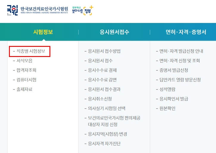 이런 요양보호사로 취업하기 위해서는 기본적으로 자격증 취득입 필수적입니다. 이와 유사한 직종별 시험은 물론 해당 자격증에 정보를 확인 할수 있는 경로를 확인해보겠습니다. 우선 한국보건의료인국가시험원홈페이지에 접속하여 "직종별 시험정보" 메뉴를 클릭해주세요.