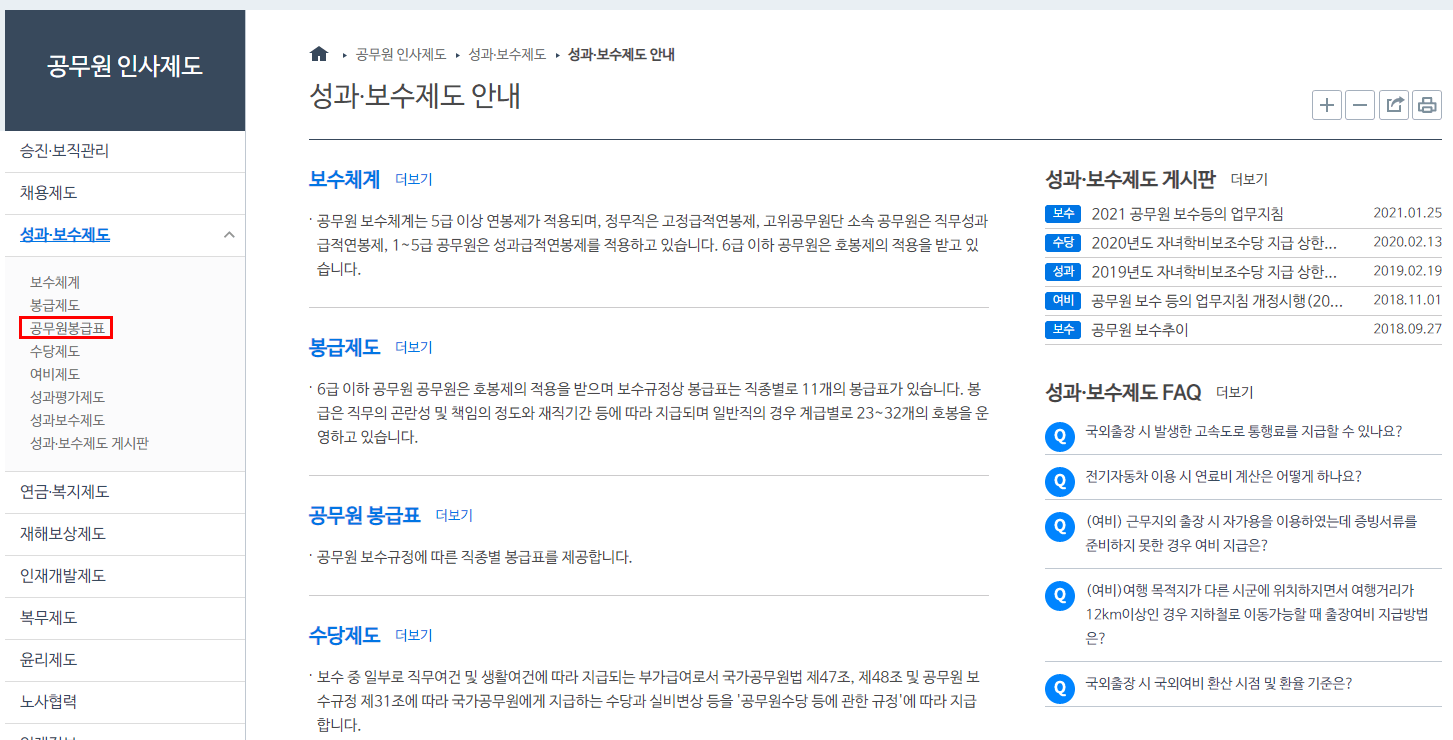 공무원 인사제도에 관련되어 있는 메뉴로 접속하게 됩니다. 해당 페이지에 보시면 공무원 봉급표 보수 체계 봉급 제도 등 다양한 공무원 관련되어 있는정보를 확인할 수 있는 페이지입니다. 해당 페이지에서 왼쪽에 있는 공무원 봉급표 메뉴를 클릭해 주세요.