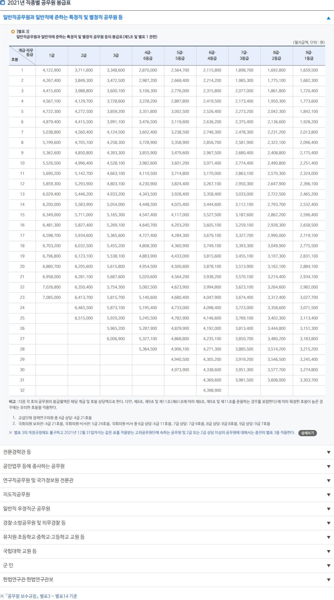 해당 영역에서 가장 상단에 있는 일반직 공무원과 일반직에 준하는 특정 직 및 별 정직 공무원 등이라는 메뉴를 클릭해 주시면 됩니다. 이외에도 다양한 공무원 직종별로 정보를 확인 할 수 있기 때문에 만약 9급 공무원 이외에 다른 봉급표를 확인하고 싶은 정보도 확인 할 수 있습니다.