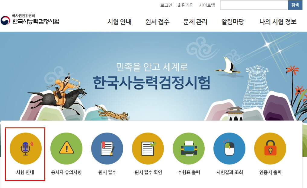 그럼 해당 사이트에서 제공하는 다양한 메뉴를 확인하고 우선 시험 안내 메뉴를 통해서 한국사 시험 일정에 대한 중요 정보를 확인해보겠습니다. 이외에도 주요 공지사항도 주기적으로 공지하고 있기 때문에 해당 정보도 확인해보세요.