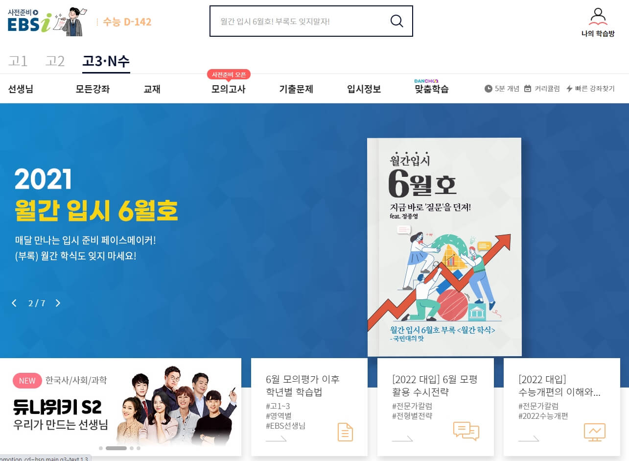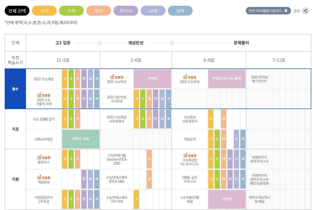 이런 고민을 EBS 기관에서 이미 인지하고 전체적인 수능 커리큘럼을 제작하여 무료로 제공하고 있습니다. 고3입무, 개념완성 그리고 본 시험 이전까지 다양한 시험에 대한 문제 풀이 과정까지 커리큘럼이 정리 되어 있으니 해당 정보도 함께 확인해보세요.