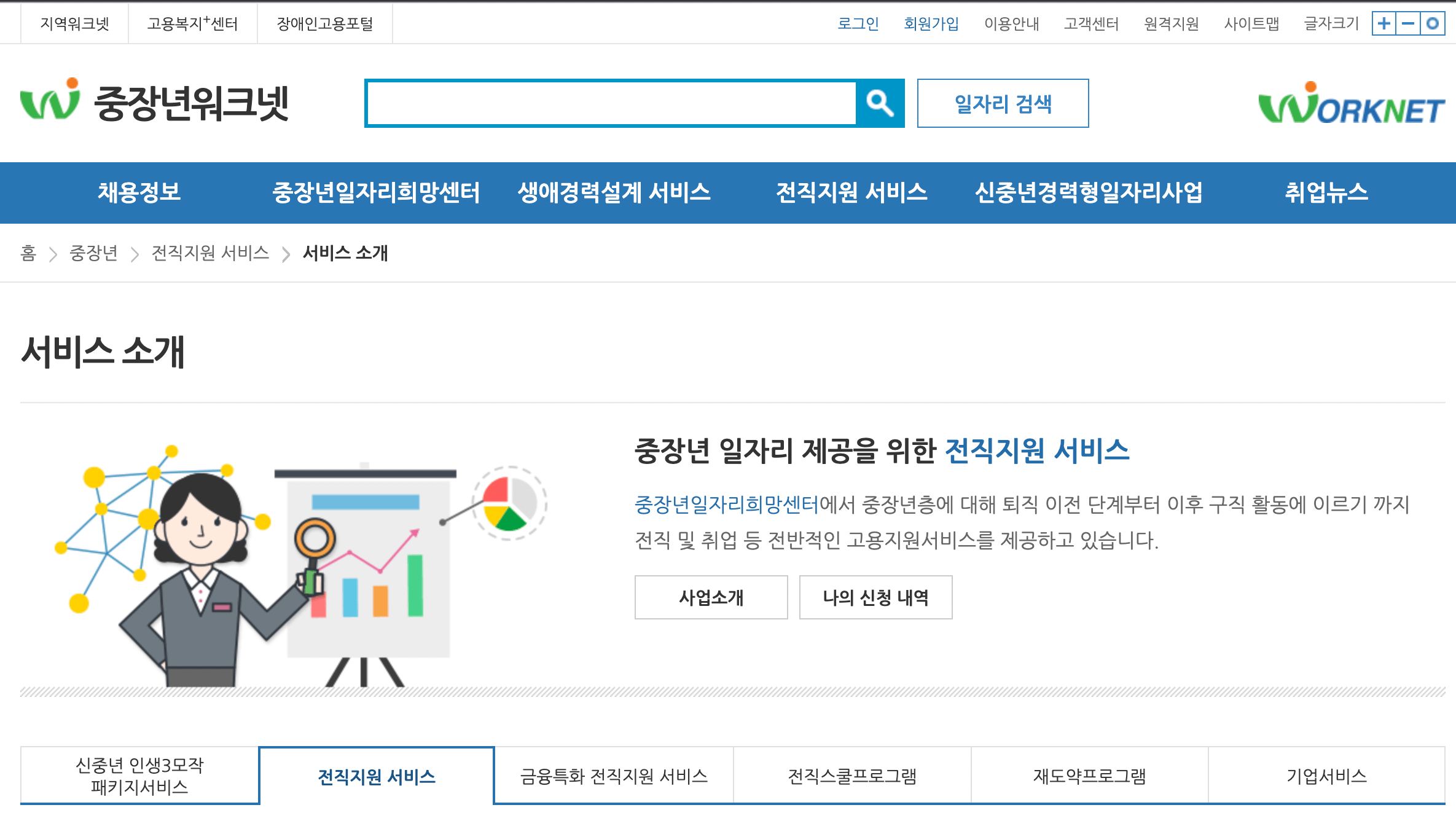 퇴직을 준비하는 시점부터 퇴직 후 구직 활동에 이르기까지 전직 및 취업을 지원하는 기관입니다. 다른 곳과 차별점은 퇴직 이전부터 일자리 창출에 필요한 서비스를 제공하고 있다는 점입니다.