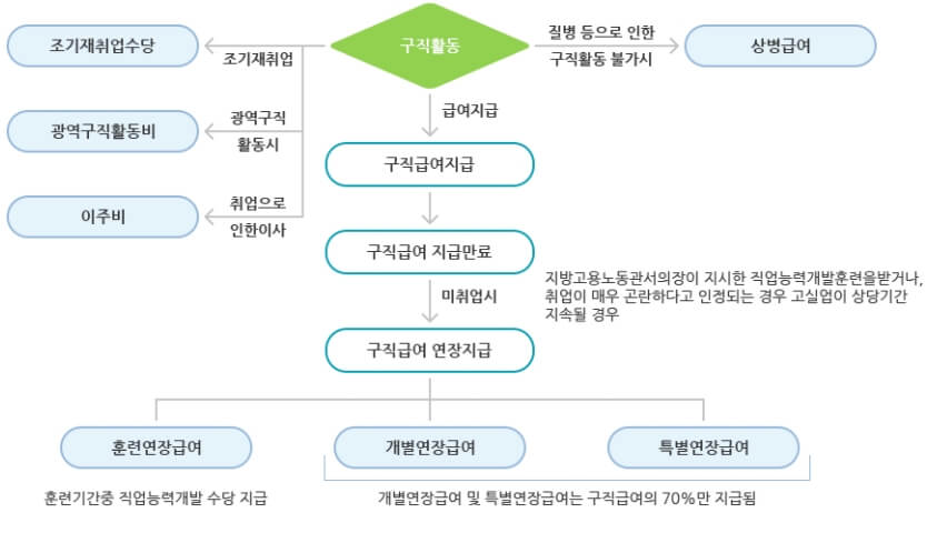 | 개별연장급여 | 취직이 특히 곤란하고 생활이 어려운 수급자로서 임금수준, 재산상황, 부양가족 여부 등을 고려하여 생계지원 등이 필요한자 |